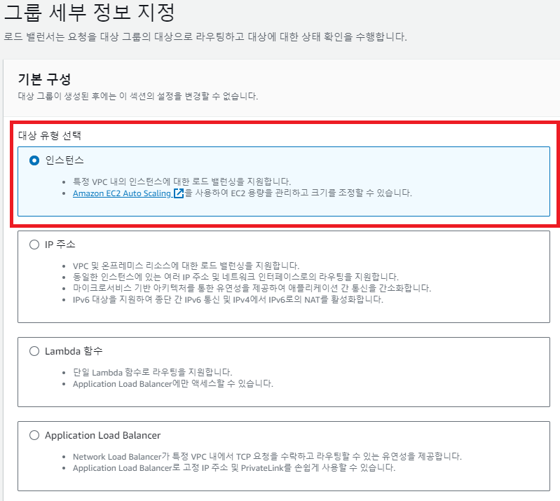 - 대상 그룹 이름과 HTTP:80으로 설정해 주고 IP 주소 유형은 IPv4