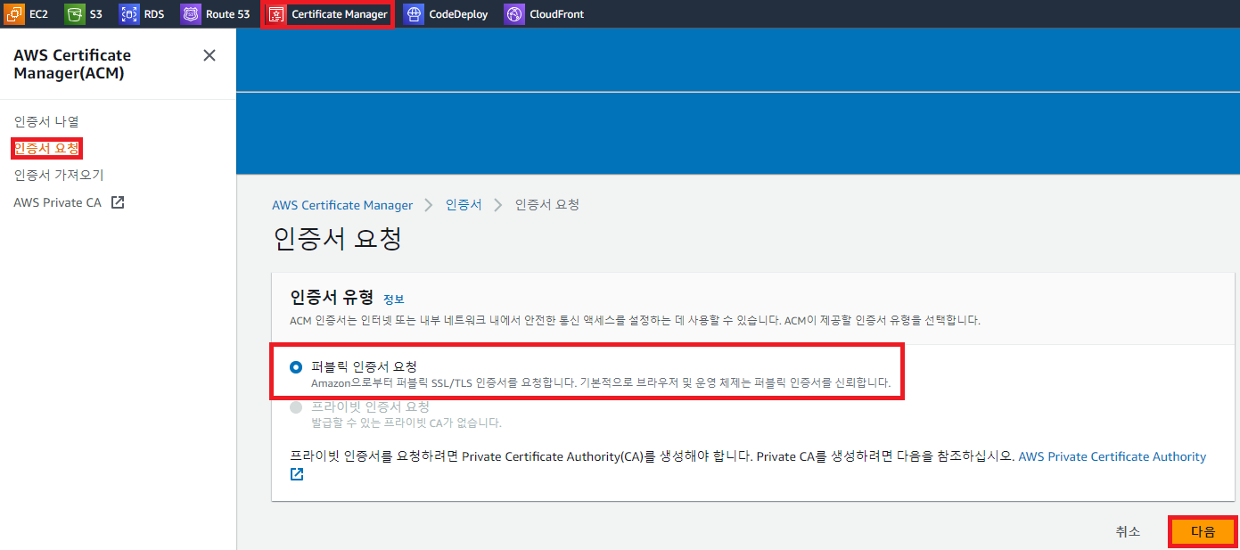 퍼블릭 호스팅 영역 선택 후 호스팅 영역 생성