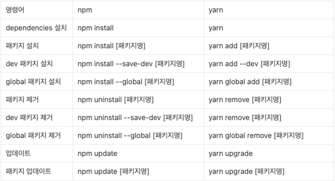 - yarn: package.json 및 yarn.lock 파일을 기반으로 필요한 모든 패키지를 설치