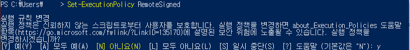 - RemoteSigned : 로컬에서 본인이 생성한 스크립트와, 신뢰할 수 있는(서명된) 스크립트 파일 실행할 수 있습니다.
